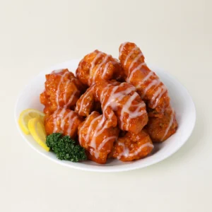| 조리방법 | 1. 쌀가루를 물 반죽 한다. (마른반죽 가능) 2. 염지된 닭을 1번에 버무린 후 180도 10~12분 튀겨낸다. (2번 튀기면 더 바삭합니다.) 3. 가열한 멕시칸레드 소스에 치킨을 넣고 버무려서 바트에 담는다. ★닭 1kg에 소스 200g 사용★ 4. 배식할 때 온마요 소스를 뿌려 배식한다. |