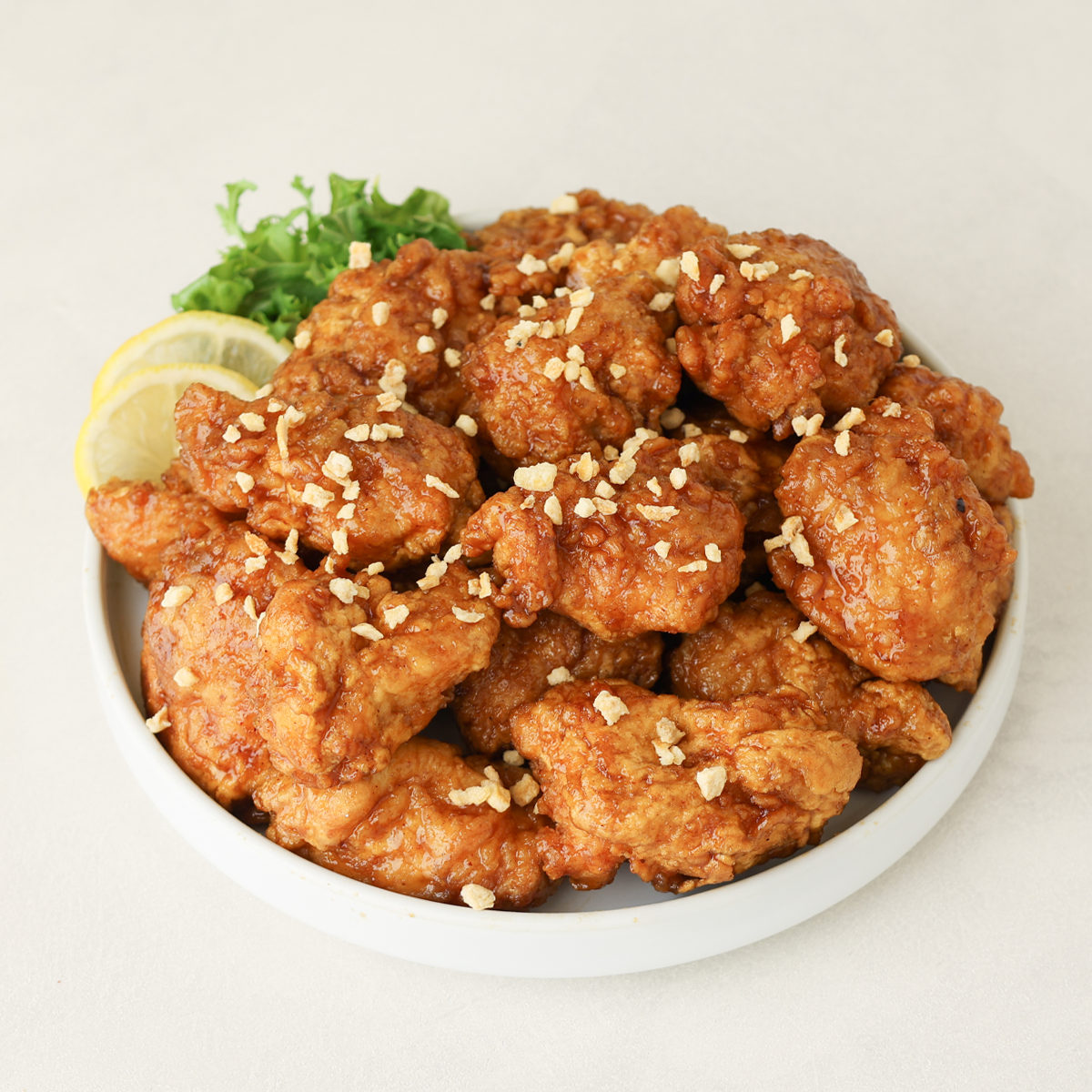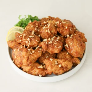 | 조리방법 | ① 쌀가루를 물 반죽 한다. ② 염지된 닭을 ①번에 버무린 후 180도 10~12분 튀겨낸다. ③ 가열한 갈릭소이소스에 튀긴 닭을 넣고 빠르게 버무려 둔다. ④ 준비된 닭에 마늘후레이크를 뿌려 배식한다. |